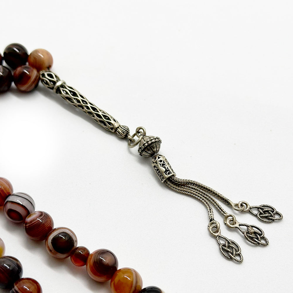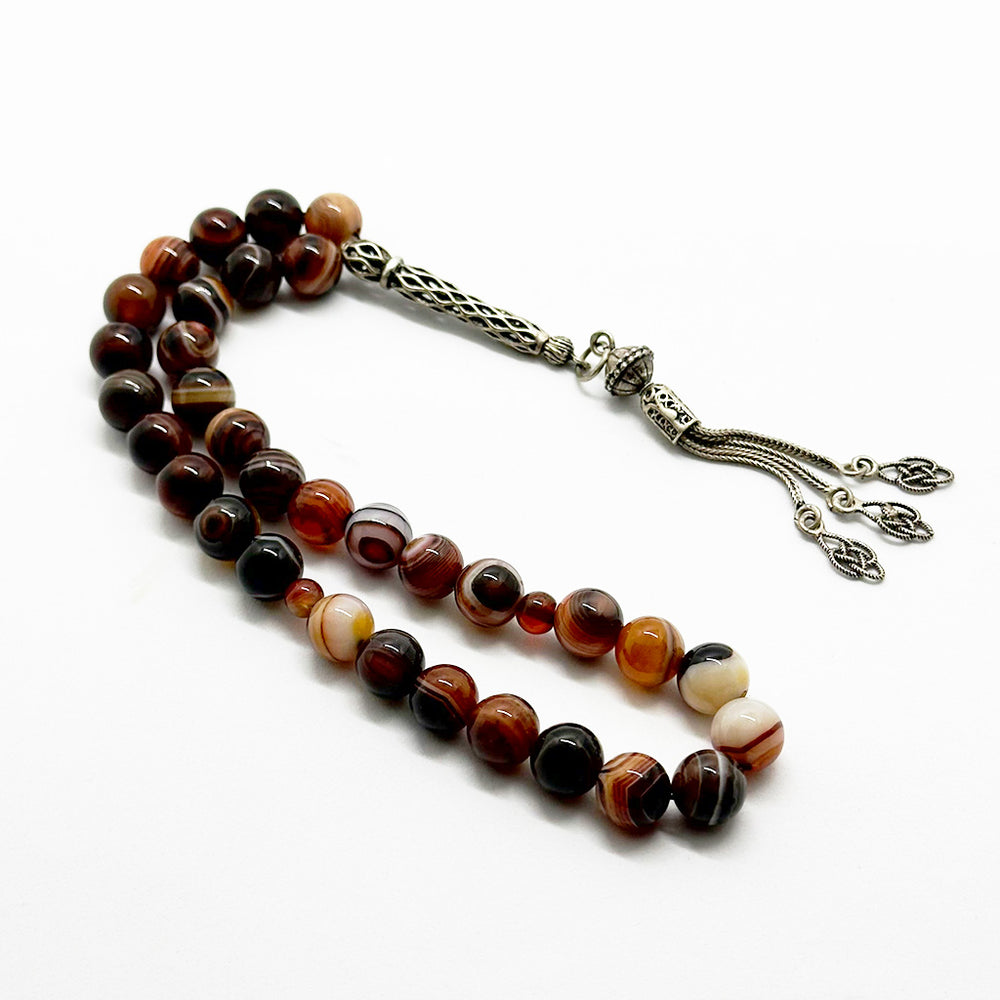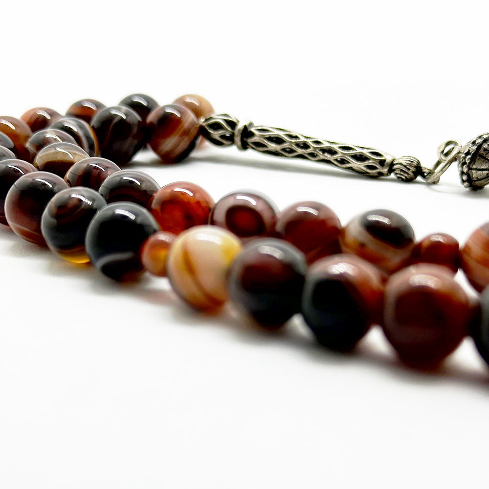 سبحة مصنوعة من حجر العقيق السليماني عيون أحمر الطبيعي، مكوّنة من 33 حبّة بمقاس 10 مم، مزوّدة بدلاية من الفضة عيار 999. مناسبة للاستخدام اليومي في الذكر، مع وزن متوازن وملمس ناعم.