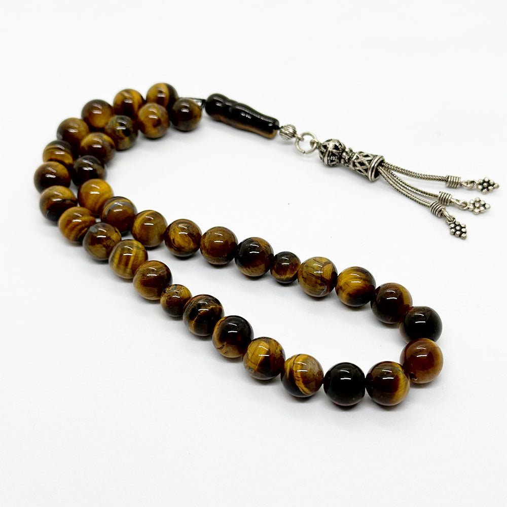 سبحة مصنوعة من حجر عين النمر الطبيعي، مكوّنة من 33 حبّة بمقاس 10 مم، مزوّدة بدلاية فضة. مناسبة للاستخدام اليومي في الذكر، مع بريق طبيعي وملمس متوازن في اليد.